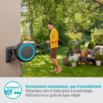 Le dévidoir automatique mural RollUp L 30 m GARDENA est idéal pour arroser les grands jardins. C’est une solution d’arrosage et de nettoyage très pratique pour avoir son tuyau d’arrosage toujours prêt à l’emploi et bien rangé. Une fois fixé au mur, le dévidoir automatique et mural GARDENA peut pivoter à plus de 180° afin de pouvoir arroser les moindres recoins du jardin ou de la terrasse. Il suffit de tirer sur le tuyau d’arrosage pour le dérouler puis de le relâcher pour l’enrouler. Grâce à la technologie RollControl, le dévidoir automatique mural GARDENA est équipé d’un frein centrifuge, d’un ressort en acier de haute qualité pour un enroulement toujours fiable et homogène du tuyau et d’un guide-tuyau intégré pour éviter les torsions lors de l’enroulement du tuyau.