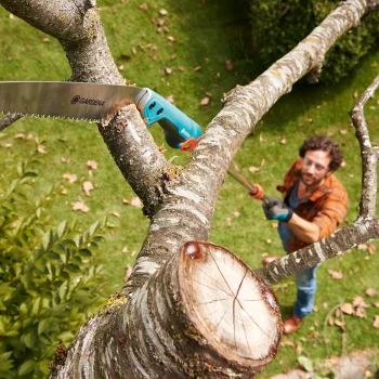 Utilisez-la comme une scie à main pour les branches faciles à atteindre. Si vous souhaitez couper dans des zones d’arbres plus élevées, combinez-la avec le manche télescopique combisystem, disponible séparément. Le cache-lame est pratique pour le rangement et le transport de la scie. L’œillet vous permet de la garder à portée de main.